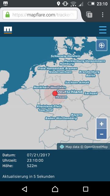 Der Mapflare Tracker ermöglicht es ihnen, kostenlos und anonym ihren aktuellen Standort fortlaufend mit beliebigen Personen zu teilen. Dafür ist keine Registrierung notwendig und der Empfänger benötigt lediglich einen Webbrowser zum Betrachten ihrer Position.