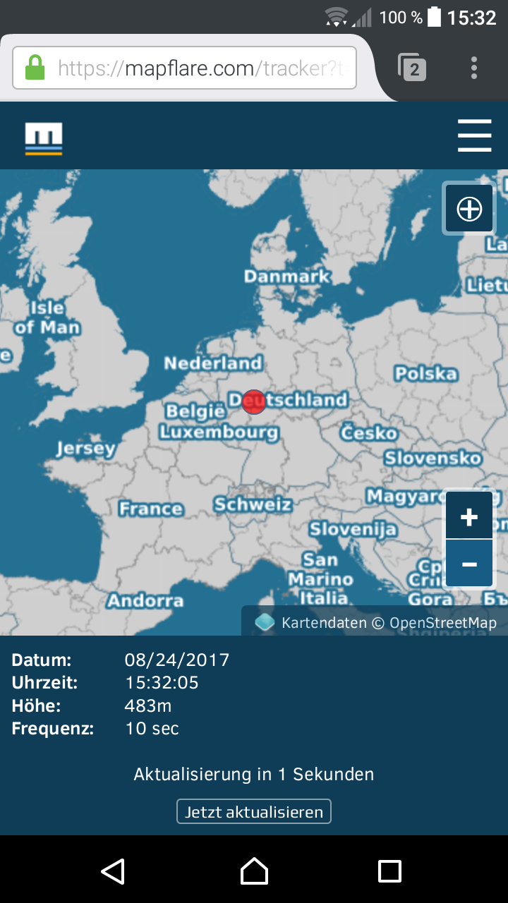 The current position can be determined by the tracker either by GPS (exact) or battery-saving with the google location service (less accurate). The determined location is then transmitted in a selectable interval (10 minutes to 5 seconds) to the Mapflare server and made available through this to the receivers.